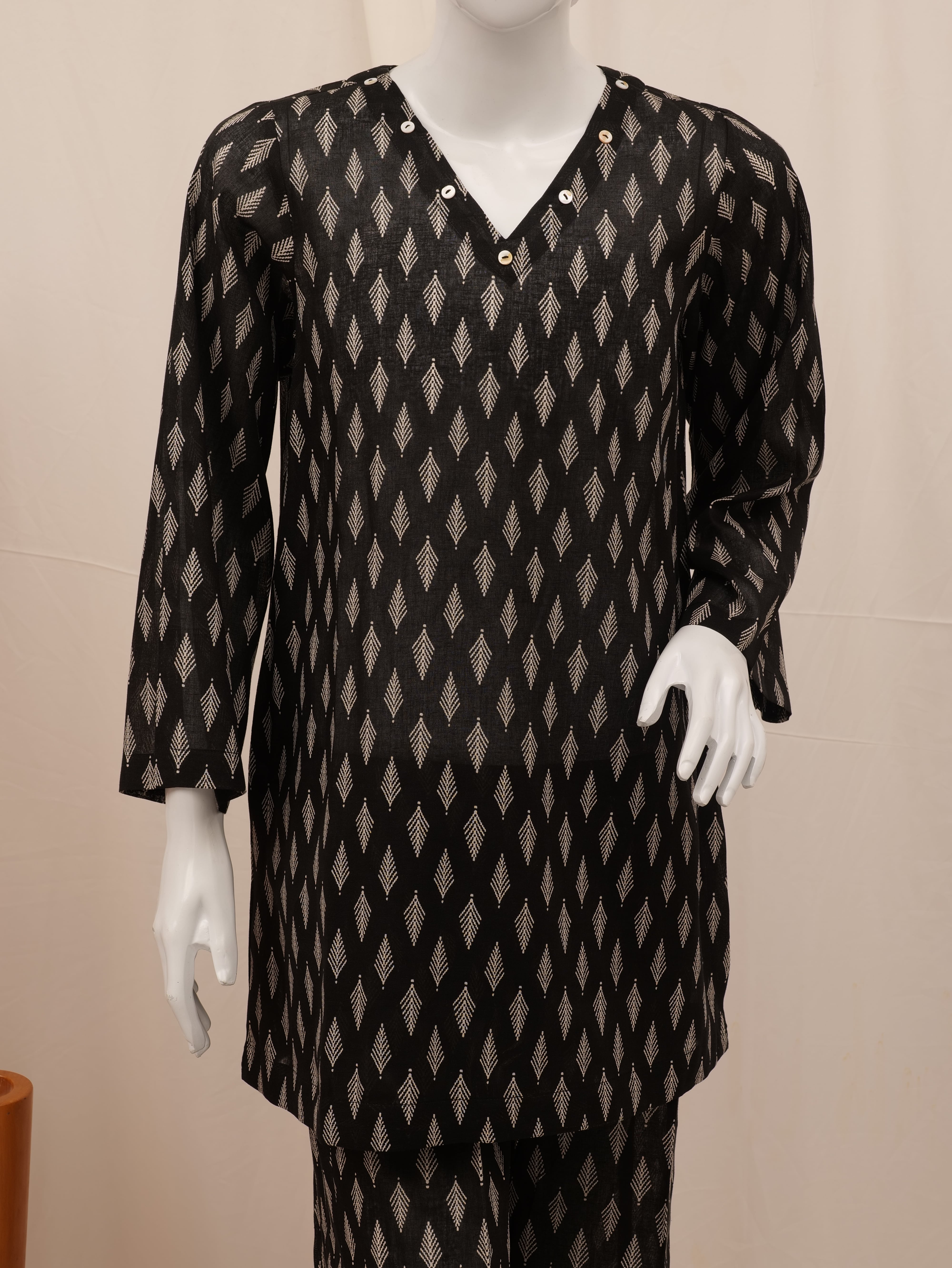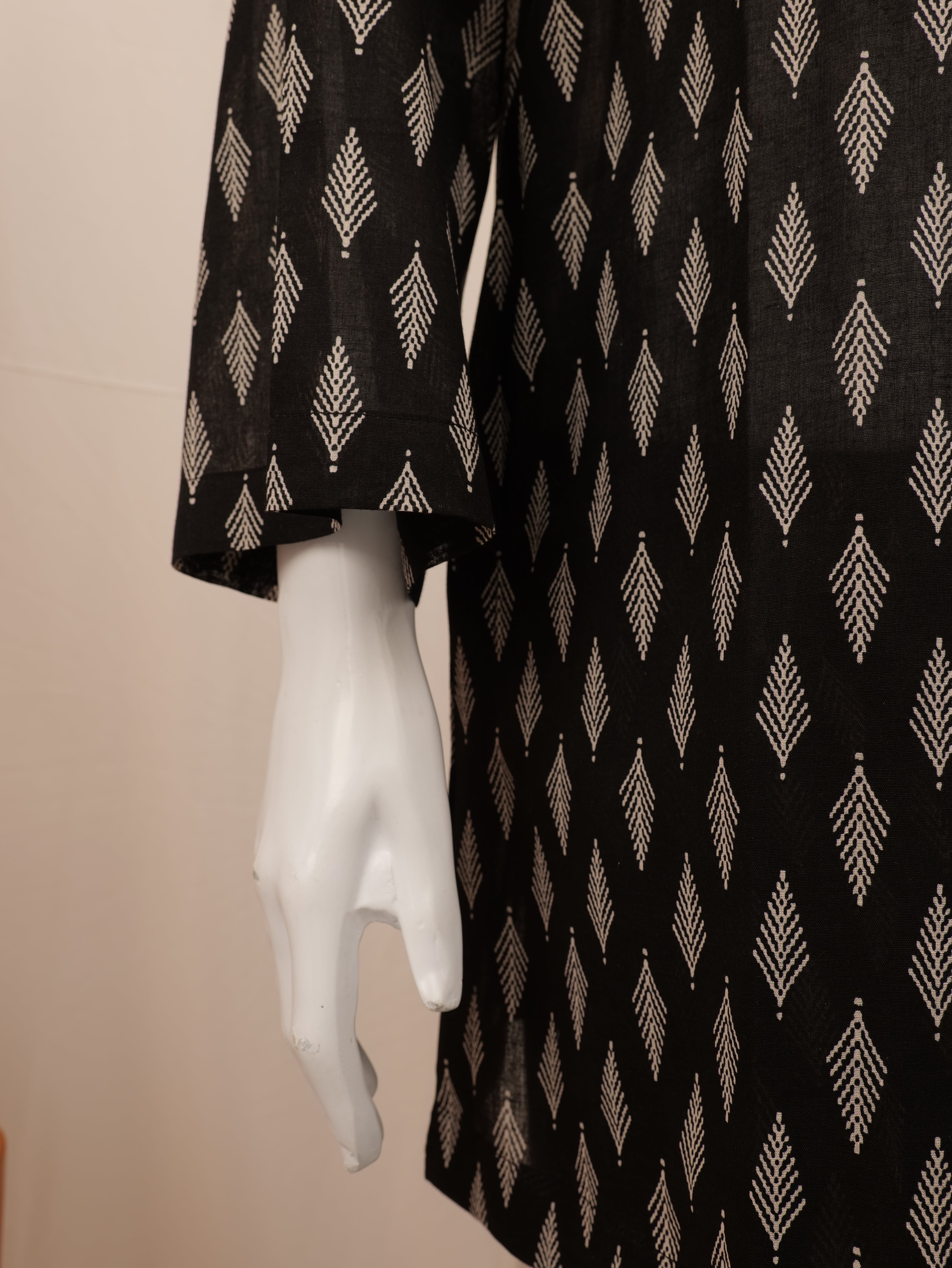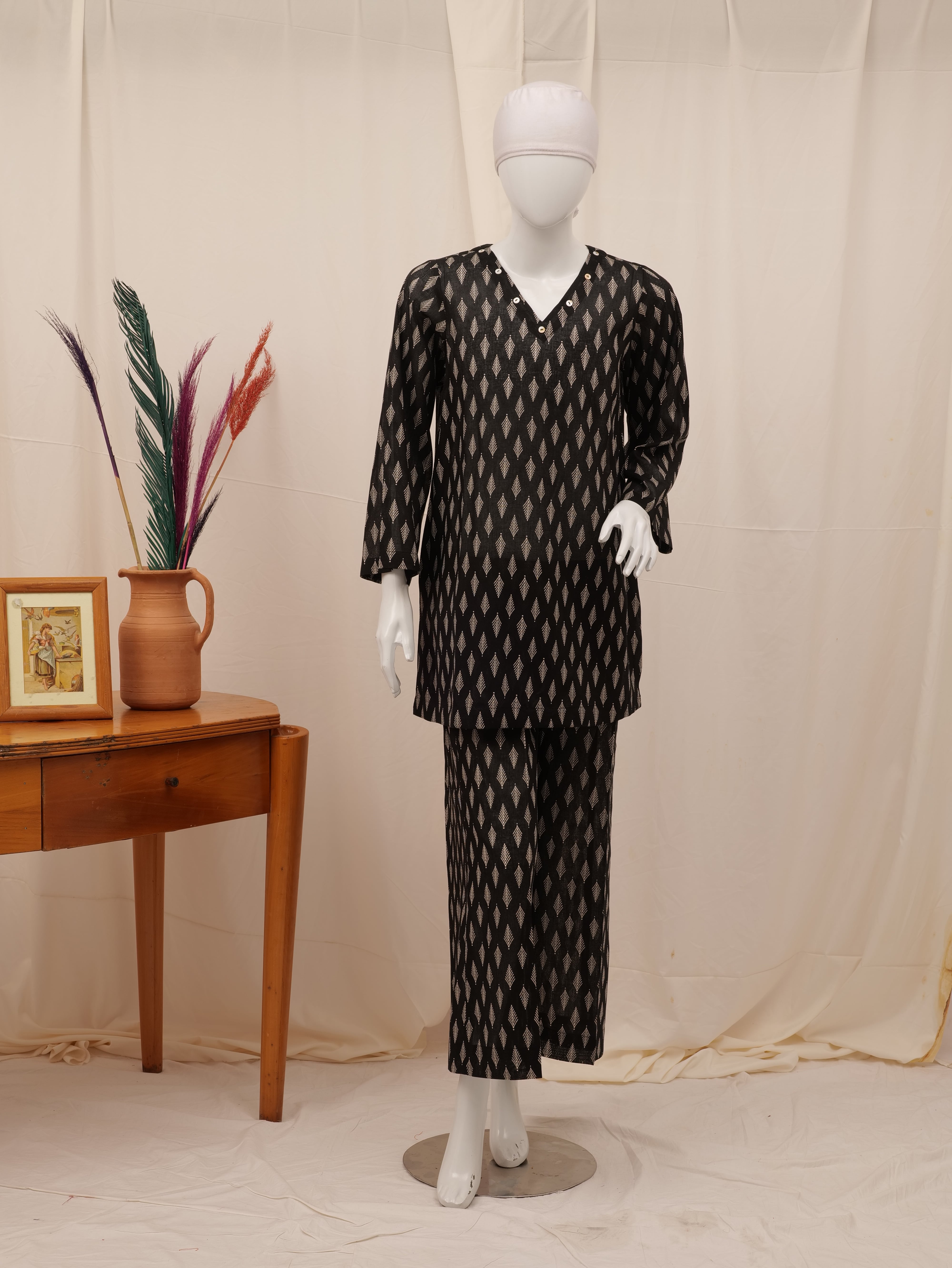 The dress is a black shalwar kameez paired with a flared short . It features long sleeves and a round neckline, showcasing traditional Pakistani attire with elegance and sophistication. The intricate gold pattern on the black fabric adds a touch of luxury and cultural charm.