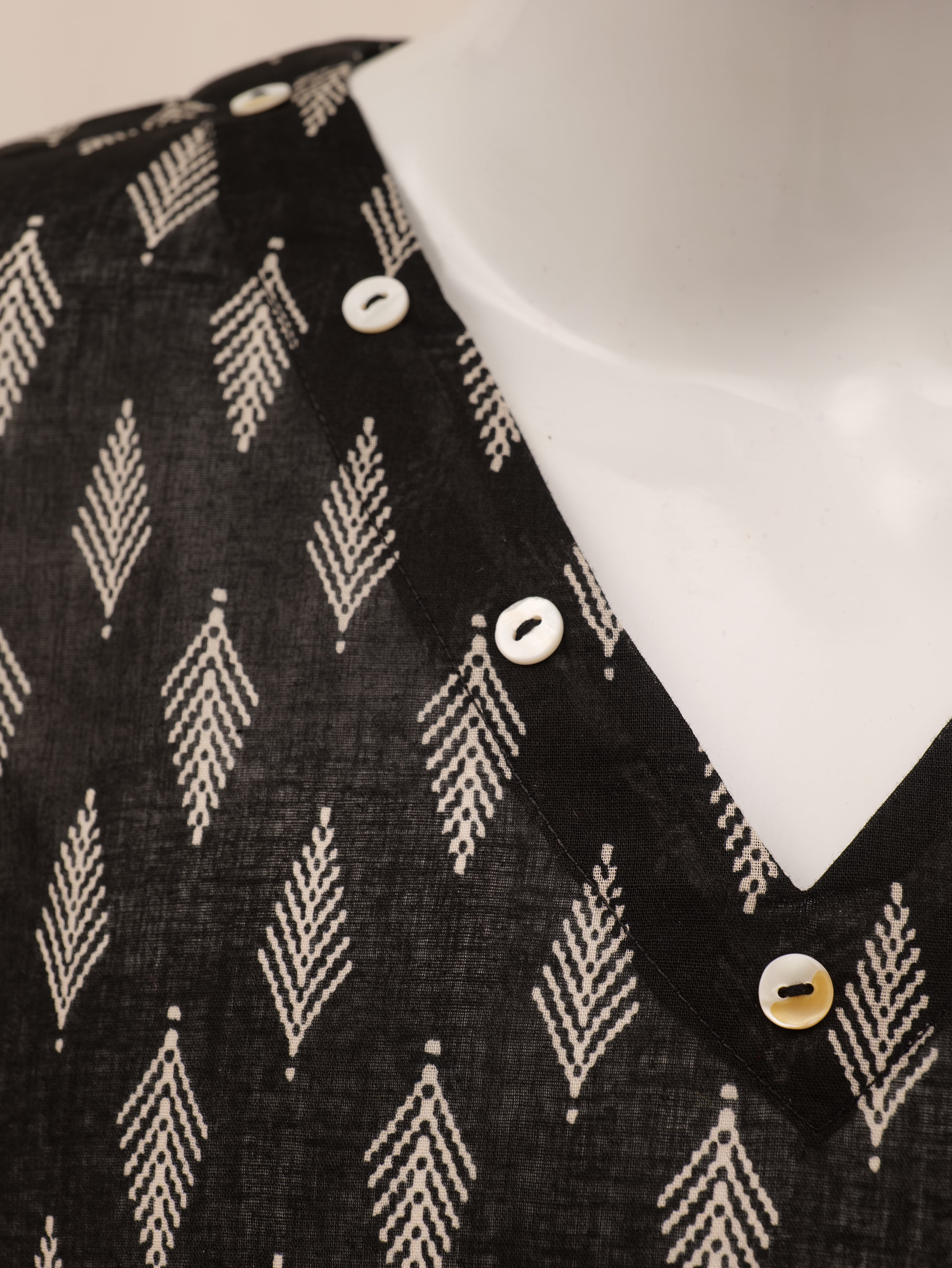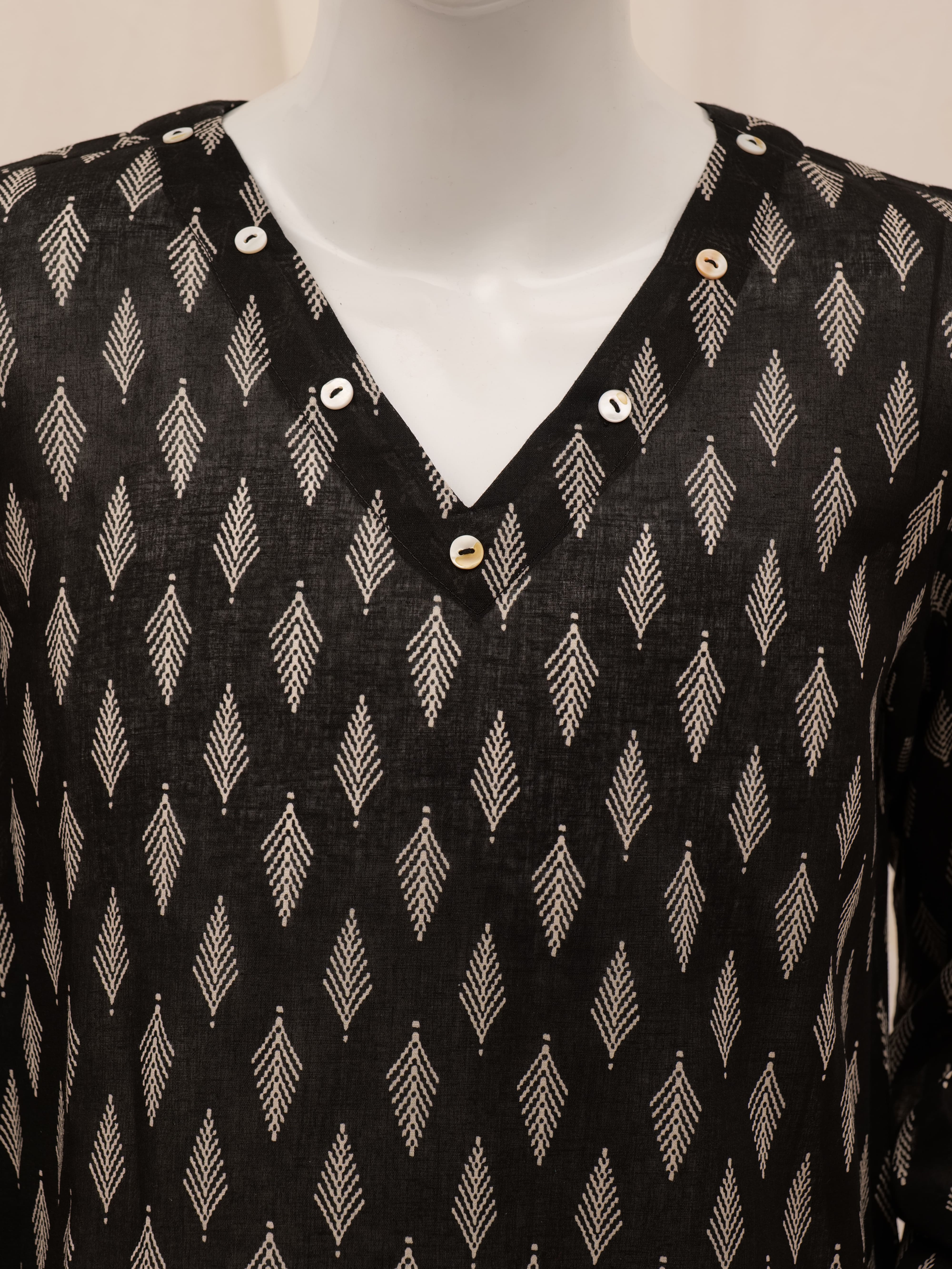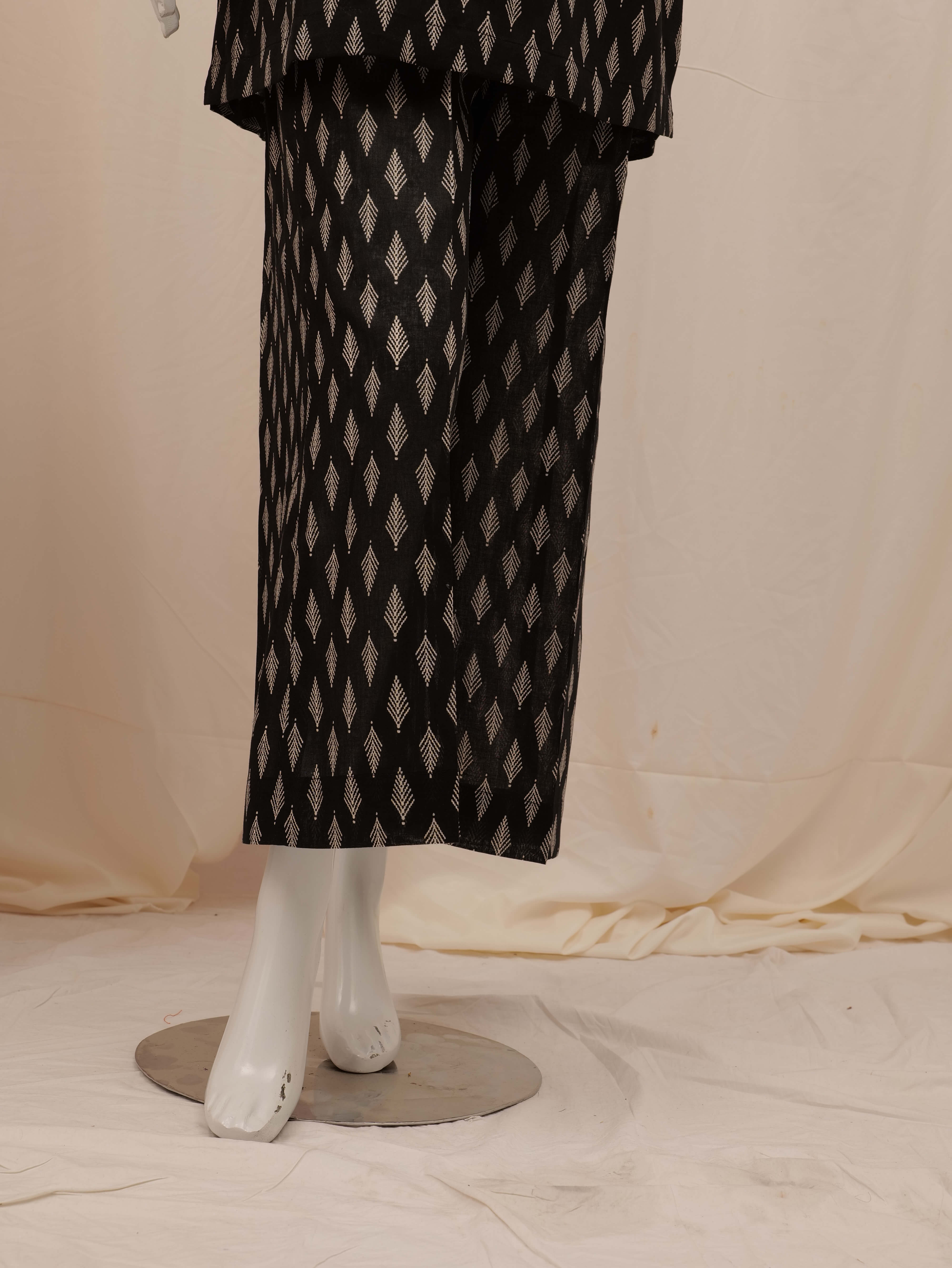 The dress is a black shalwar kameez paired with a flared short . It features long sleeves and a round neckline, showcasing traditional Pakistani attire with elegance and sophistication. The intricate gold pattern on the black fabric adds a touch of luxury and cultural charm.