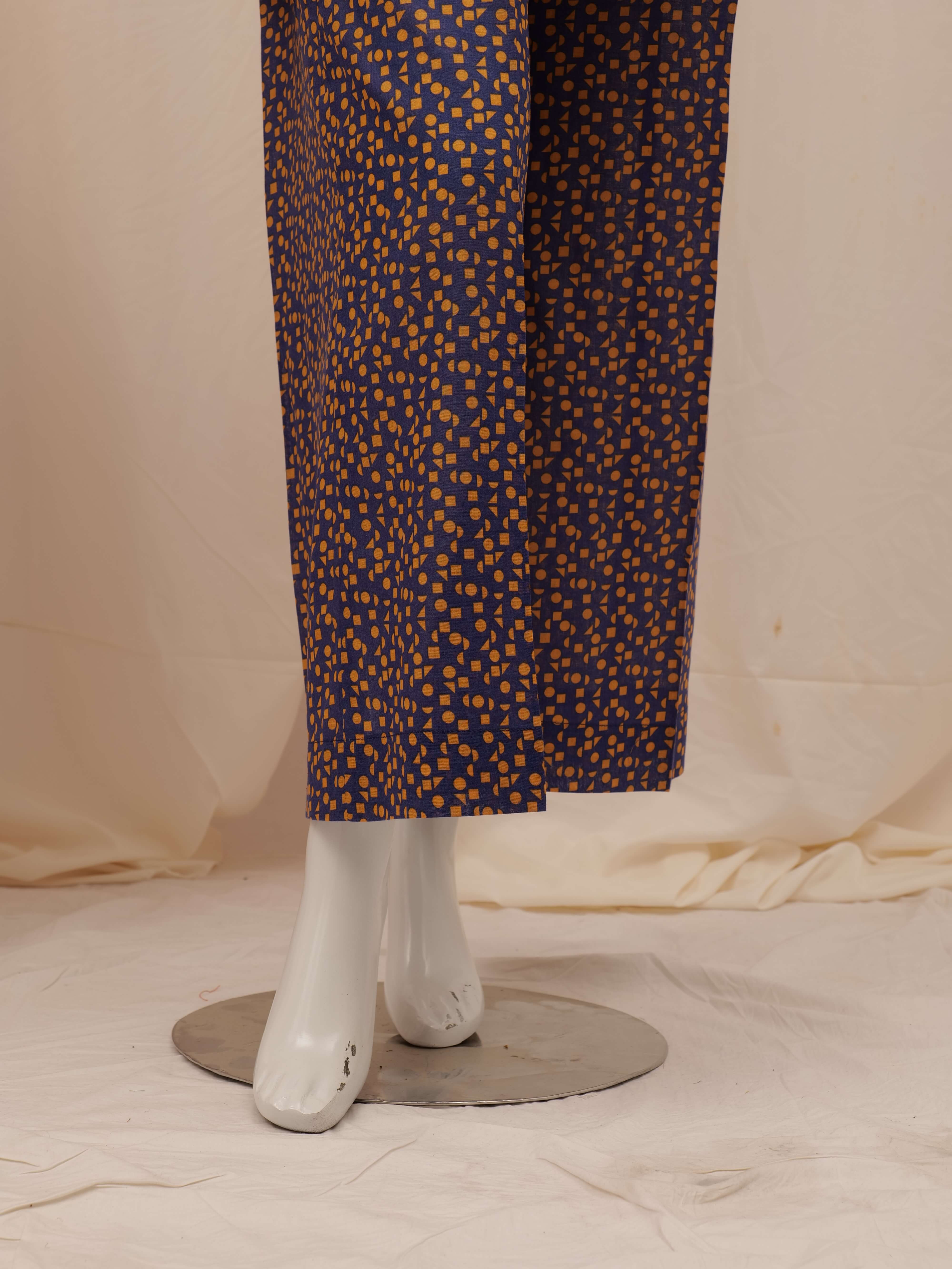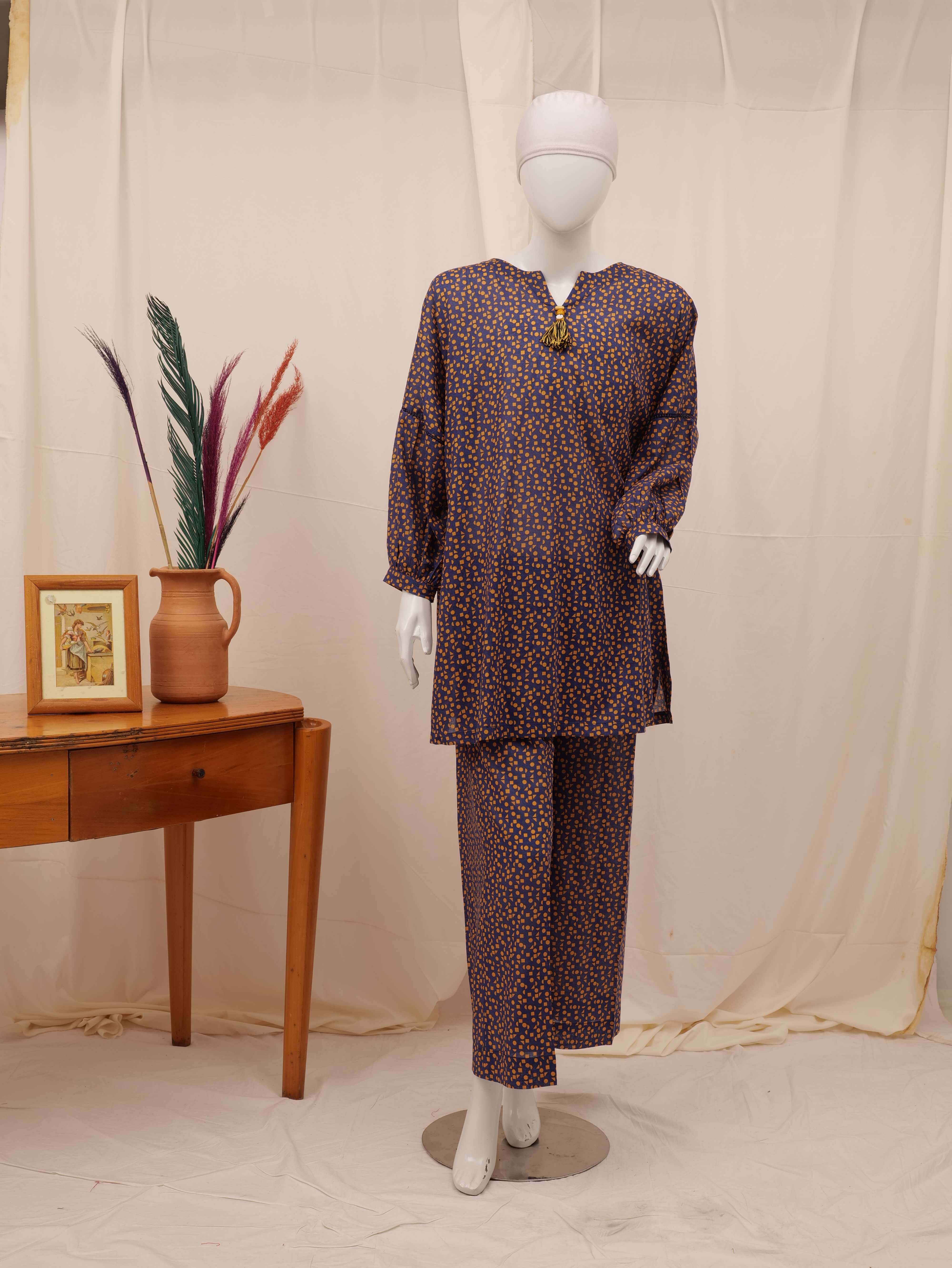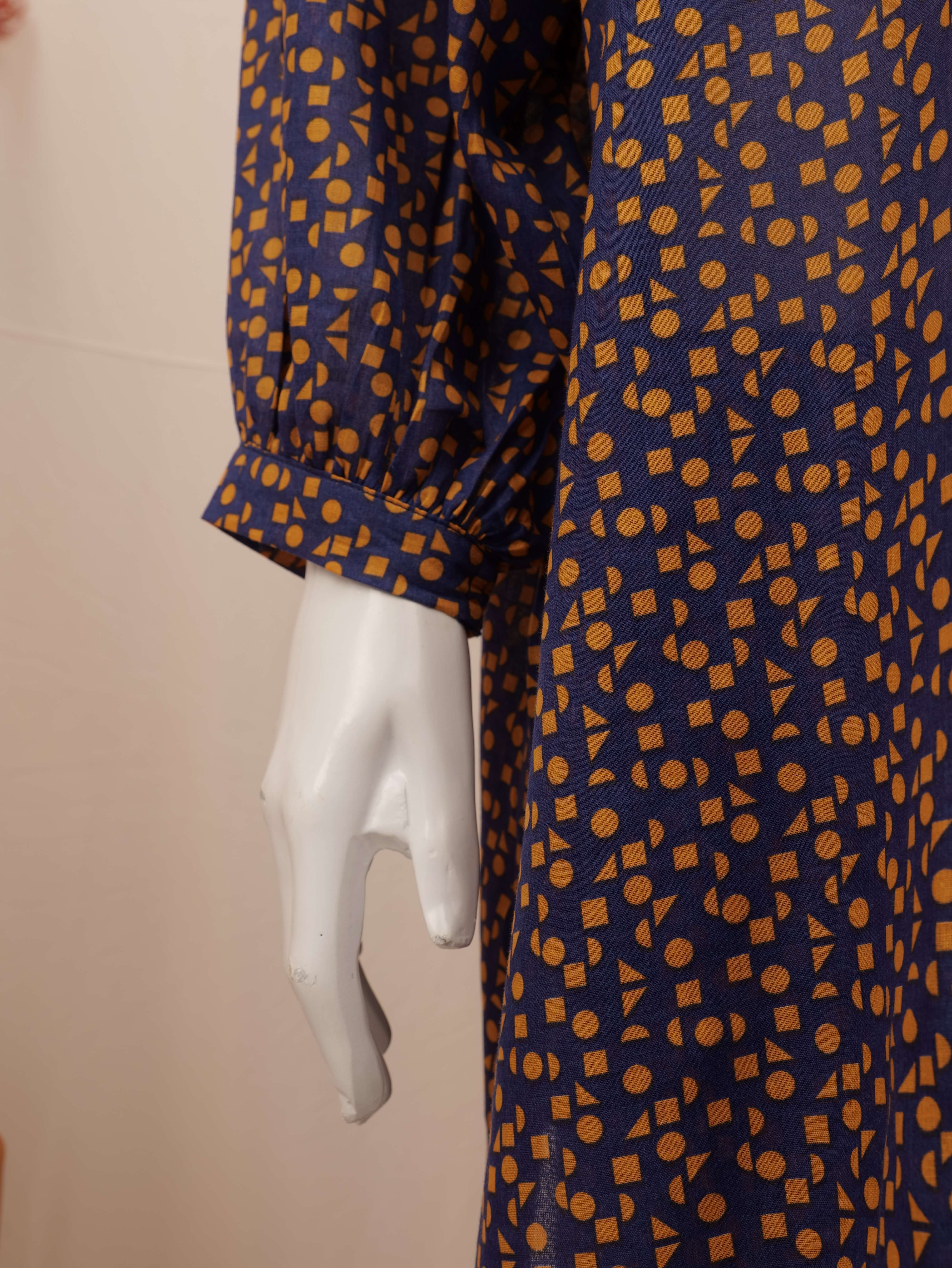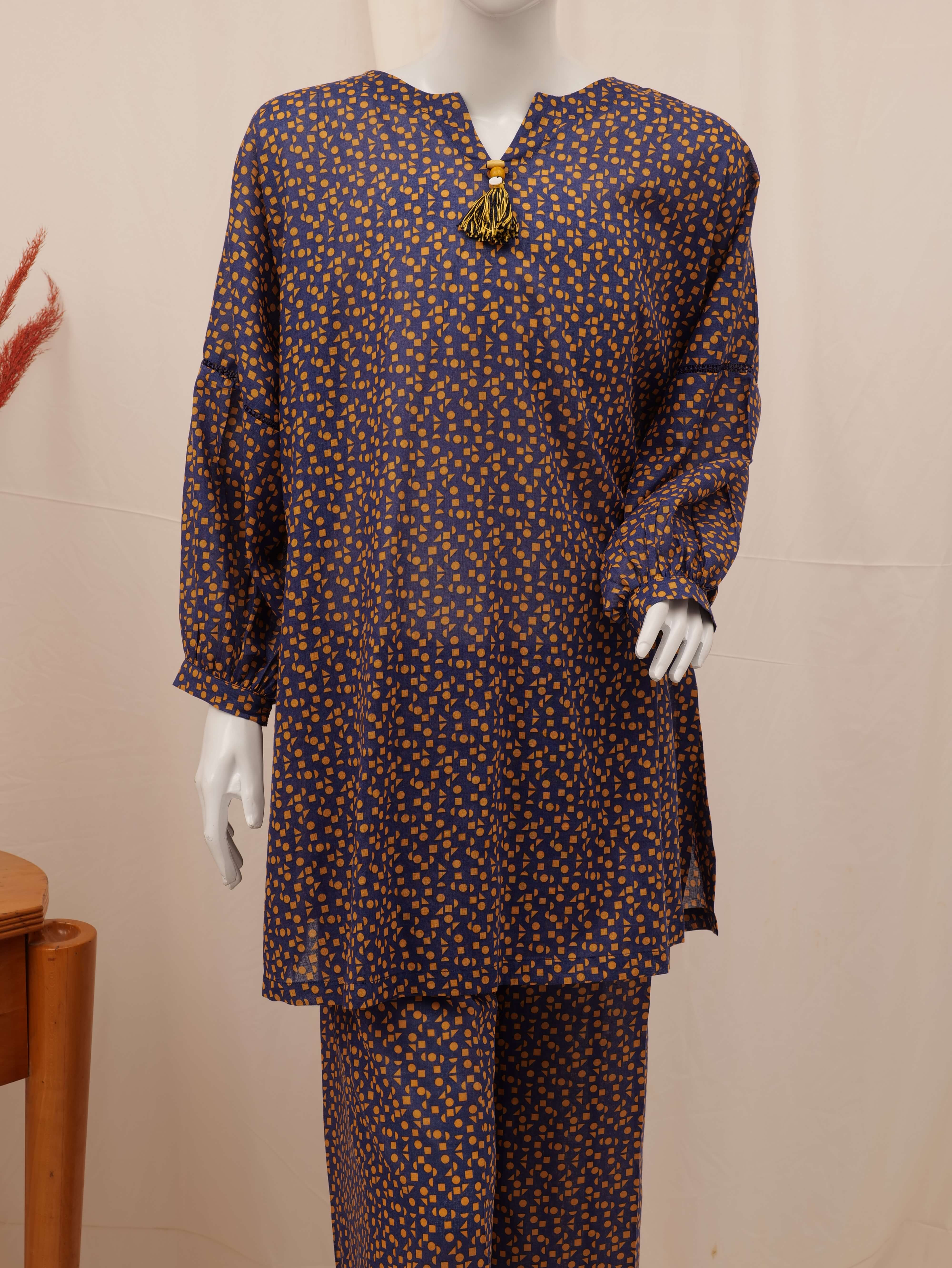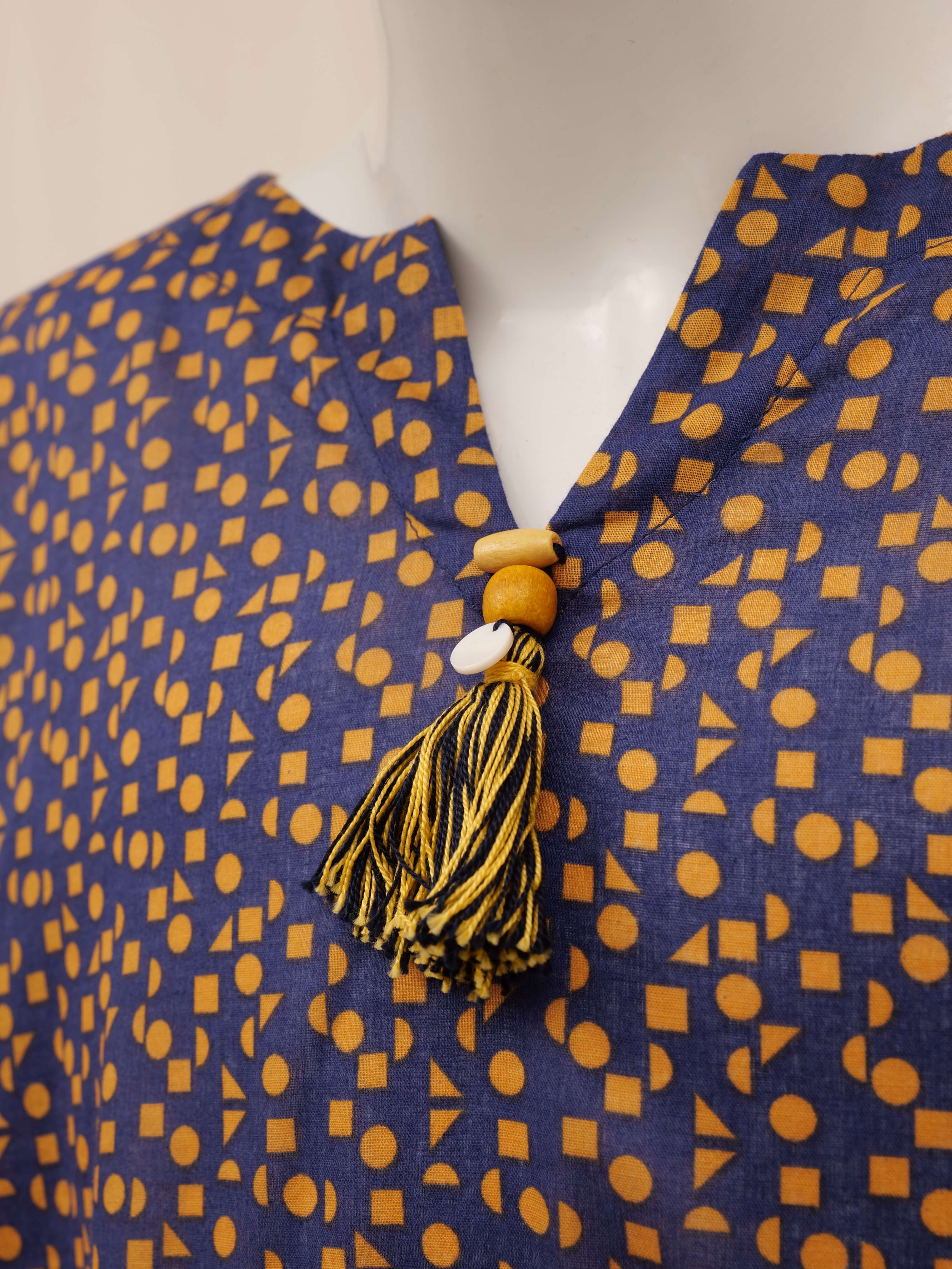 The vibrant orange dots print against the dark blue fabric create a stunning contrast, making it perfect for university fit. The addition of a blue and yellow tassel necklace enhances the overall look, adding a touch of sophistication and glamour.