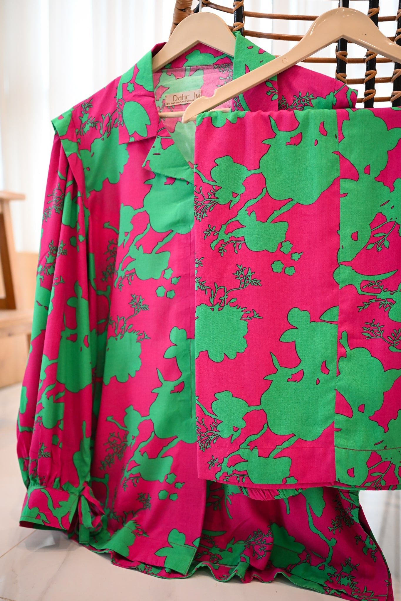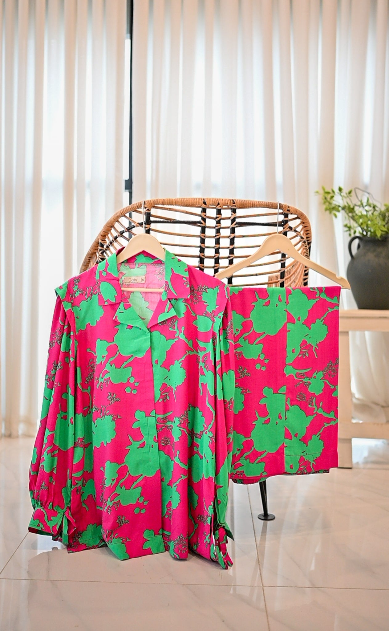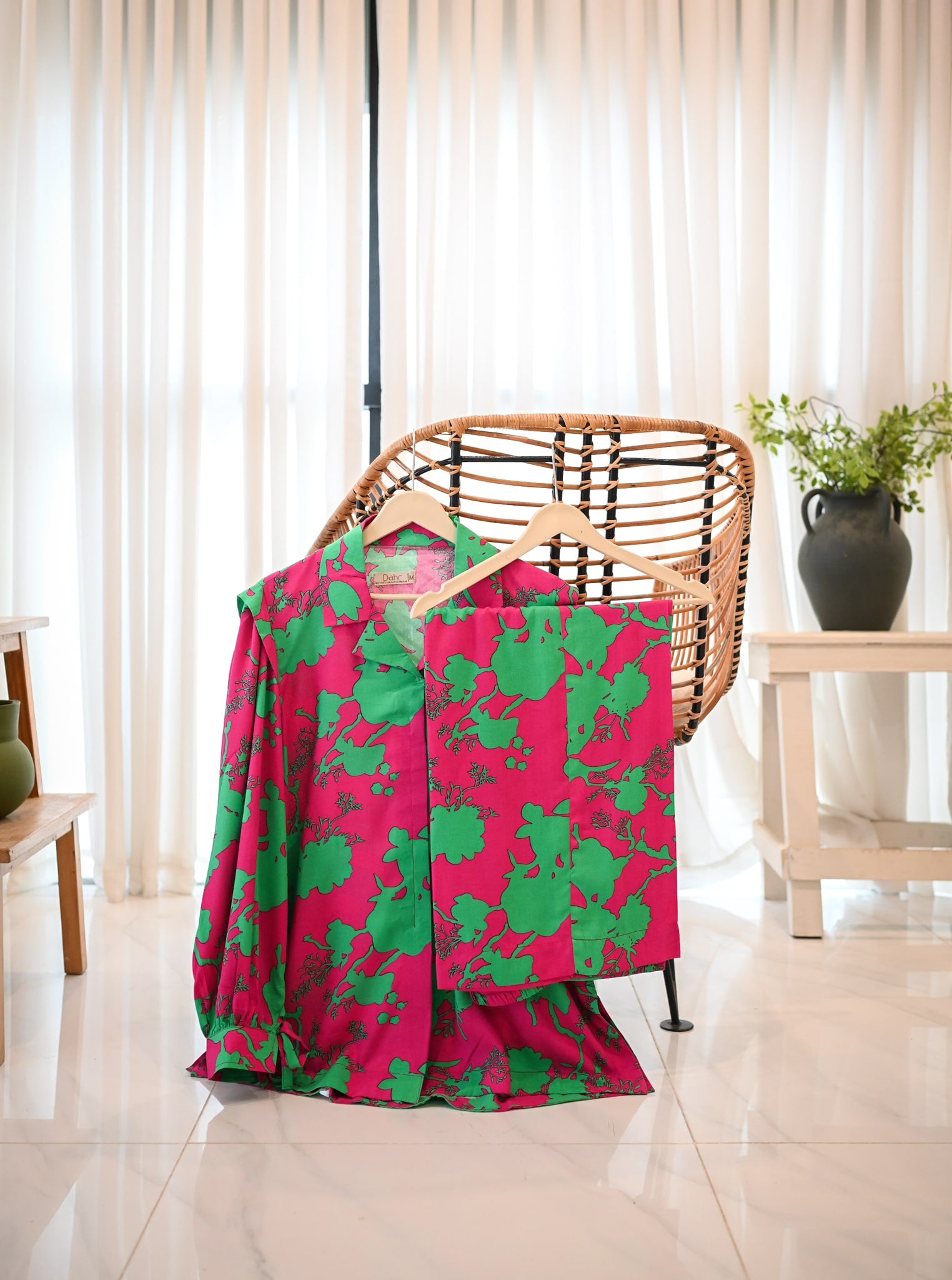 This co-ord set makes a bold, artistic fashion statement, suitable for high-fashion loungewear or creative casual wear. The contrast of vibrant green on magenta is eye-catching, modern, and playful. The relaxed tailoring ensures comfort while still being visually impactful.
