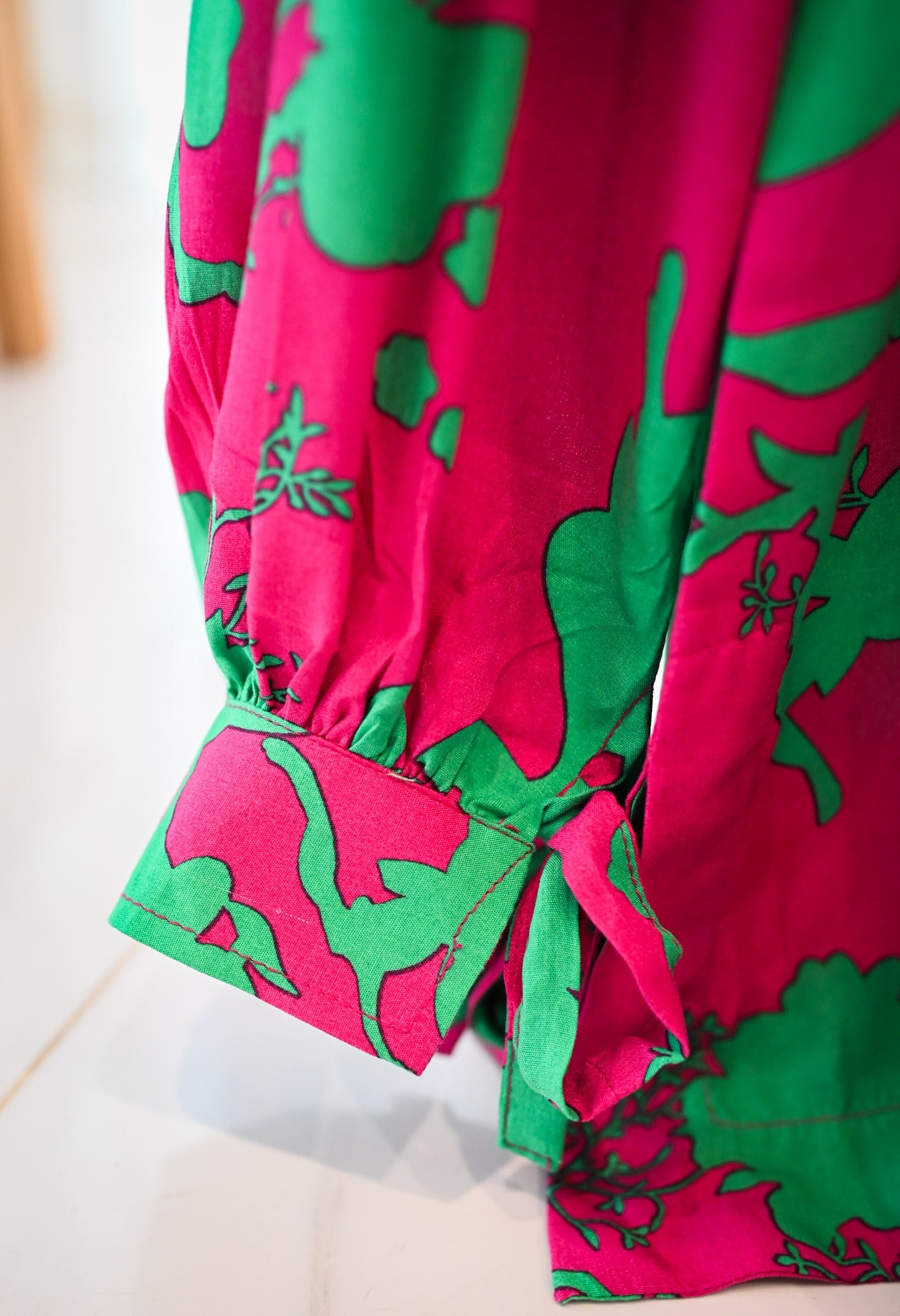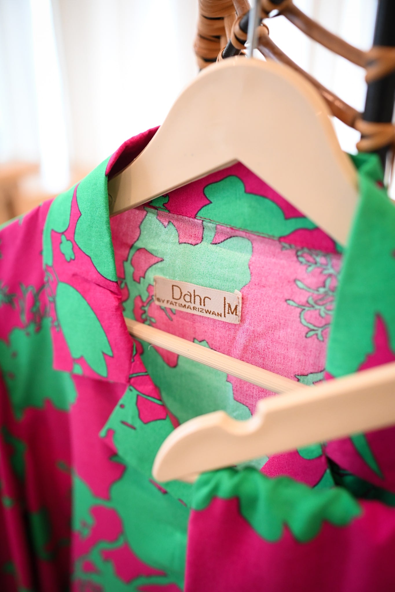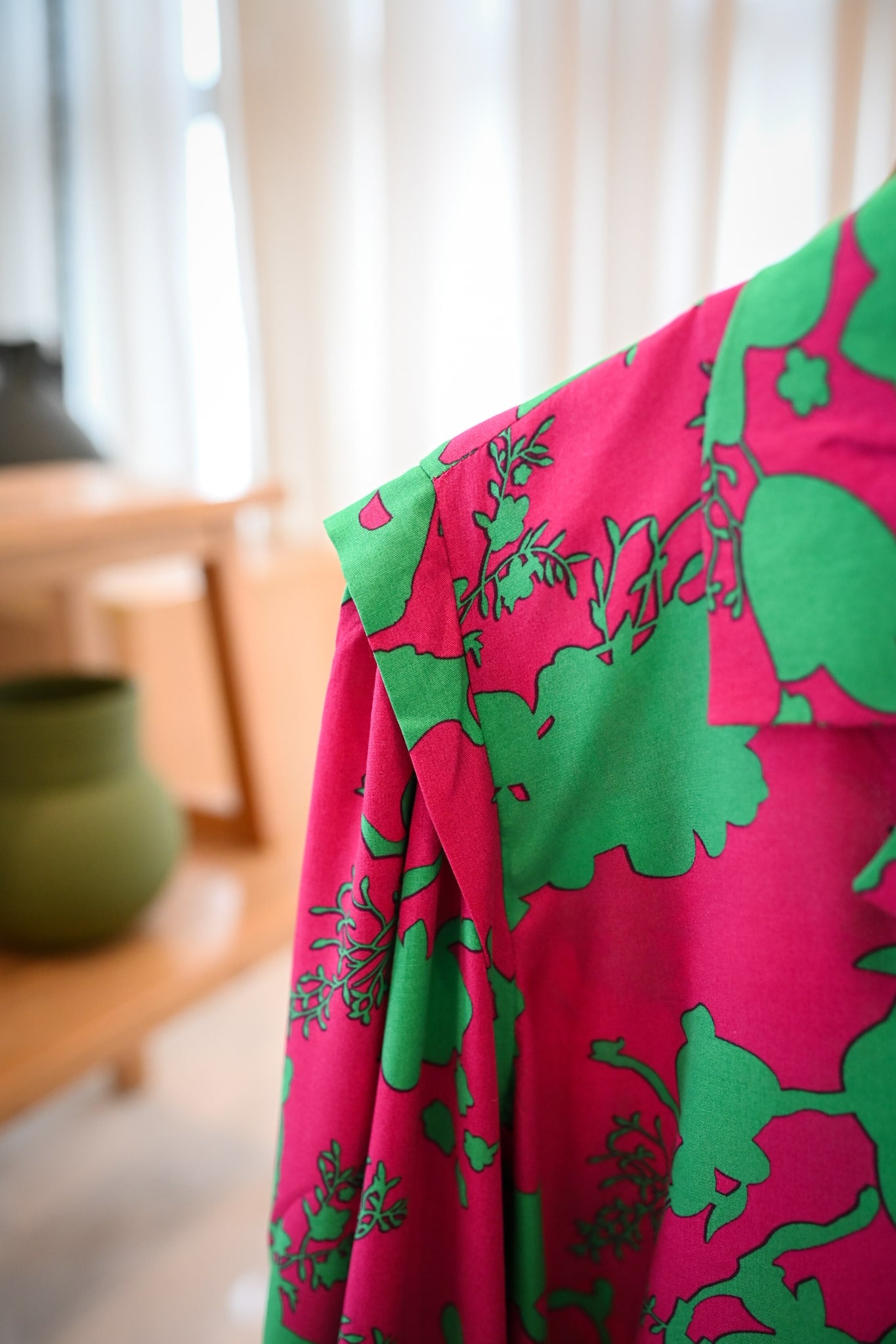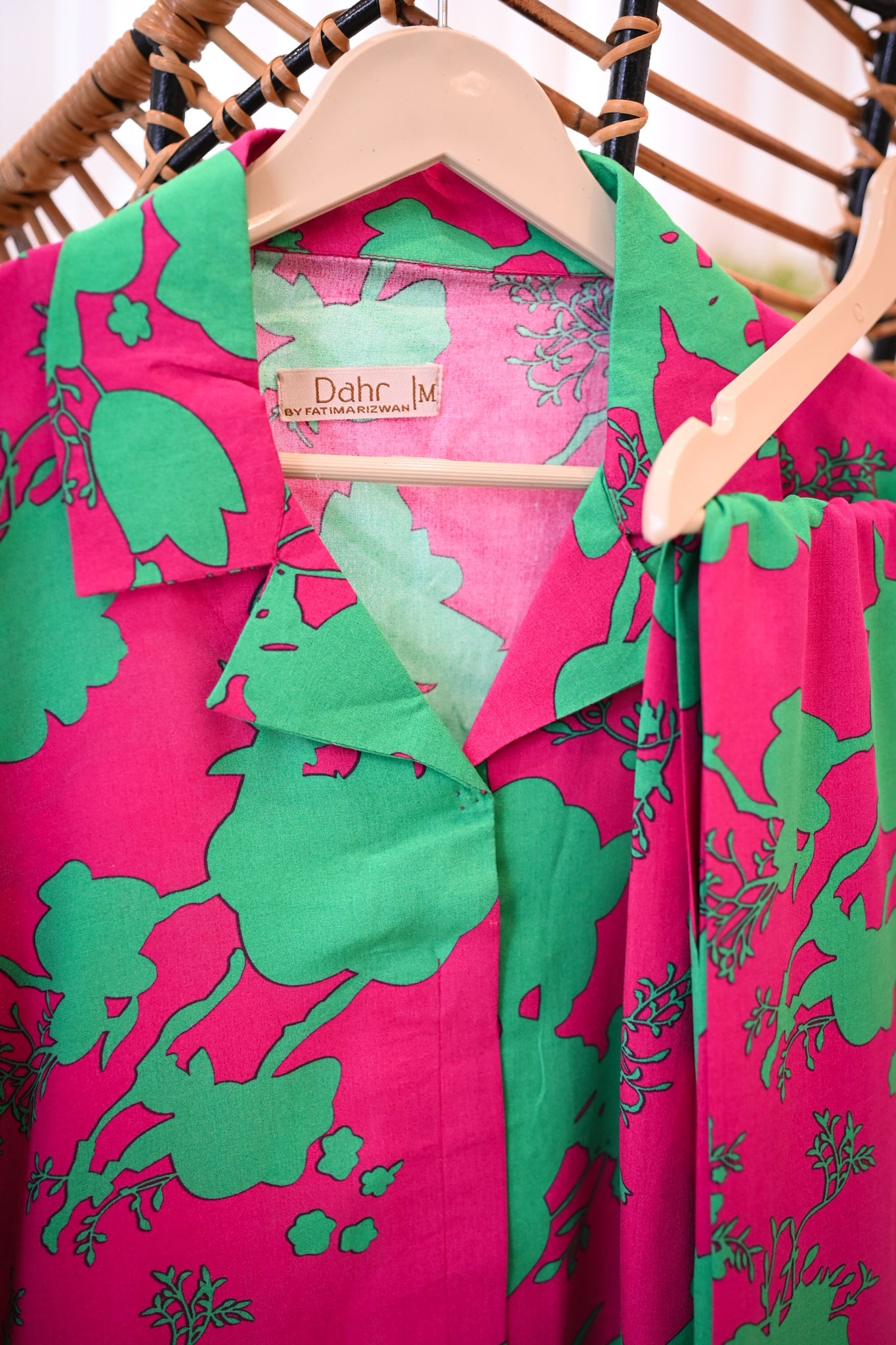 This co-ord set makes a bold, artistic fashion statement, suitable for high-fashion loungewear or creative casual wear. The contrast of vibrant green on magenta is eye-catching, modern, and playful. The relaxed tailoring ensures comfort while still being visually impactful.