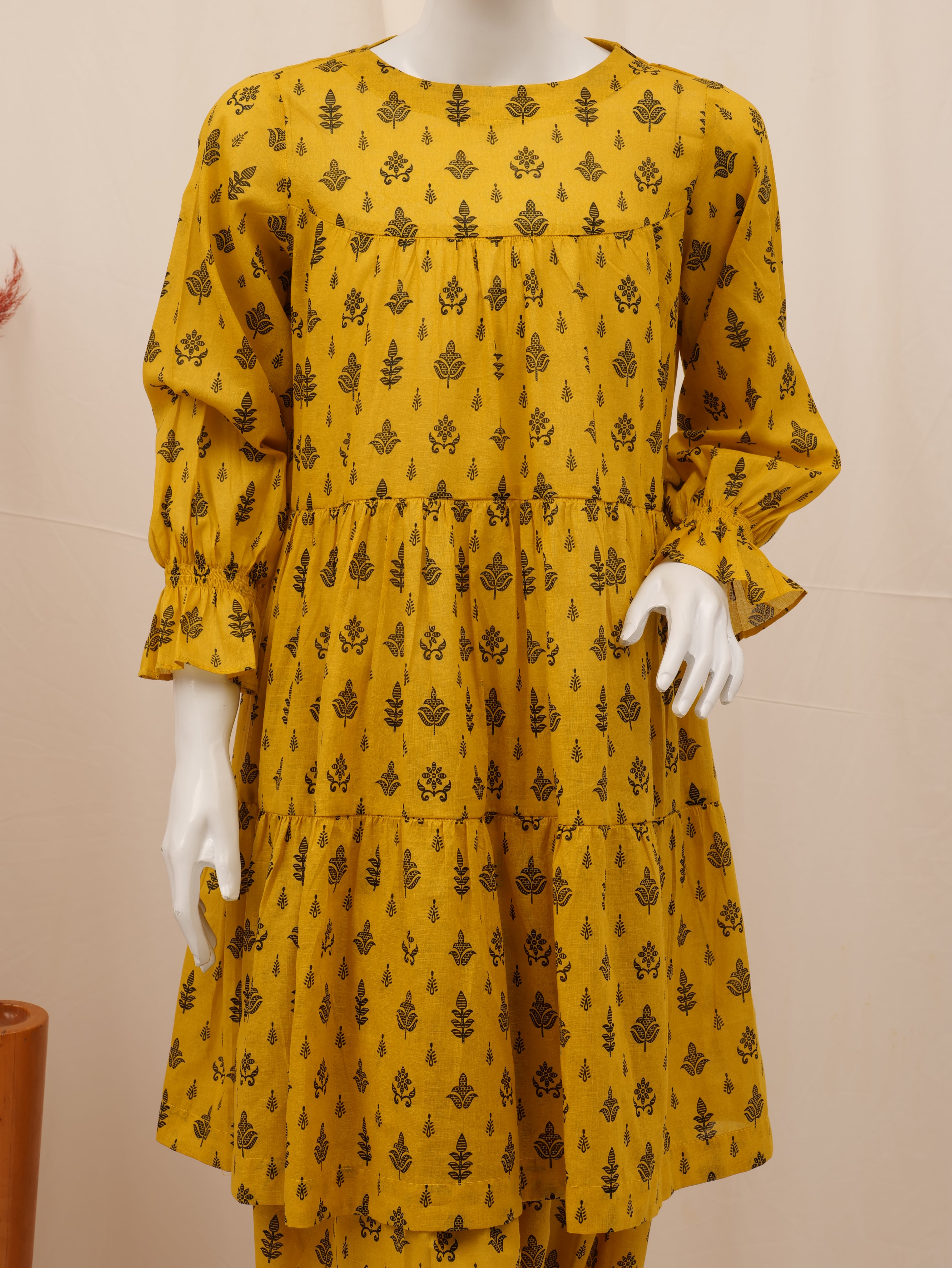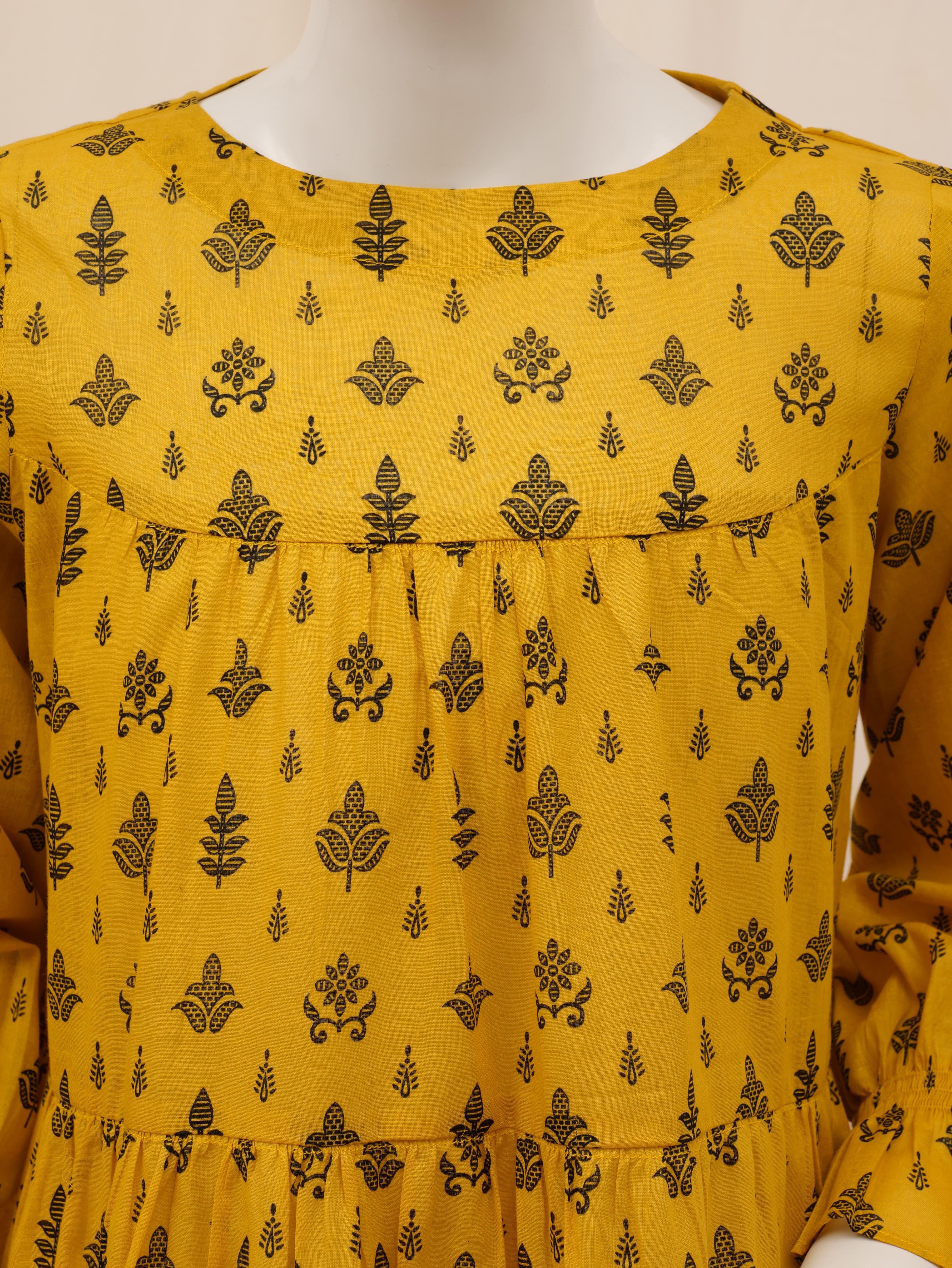 This outfit is a vibrant mustard yellow 2-piece. It features a flowy tunic top with a round neckline and long sleeves, paired with matching loose-fitting pants.