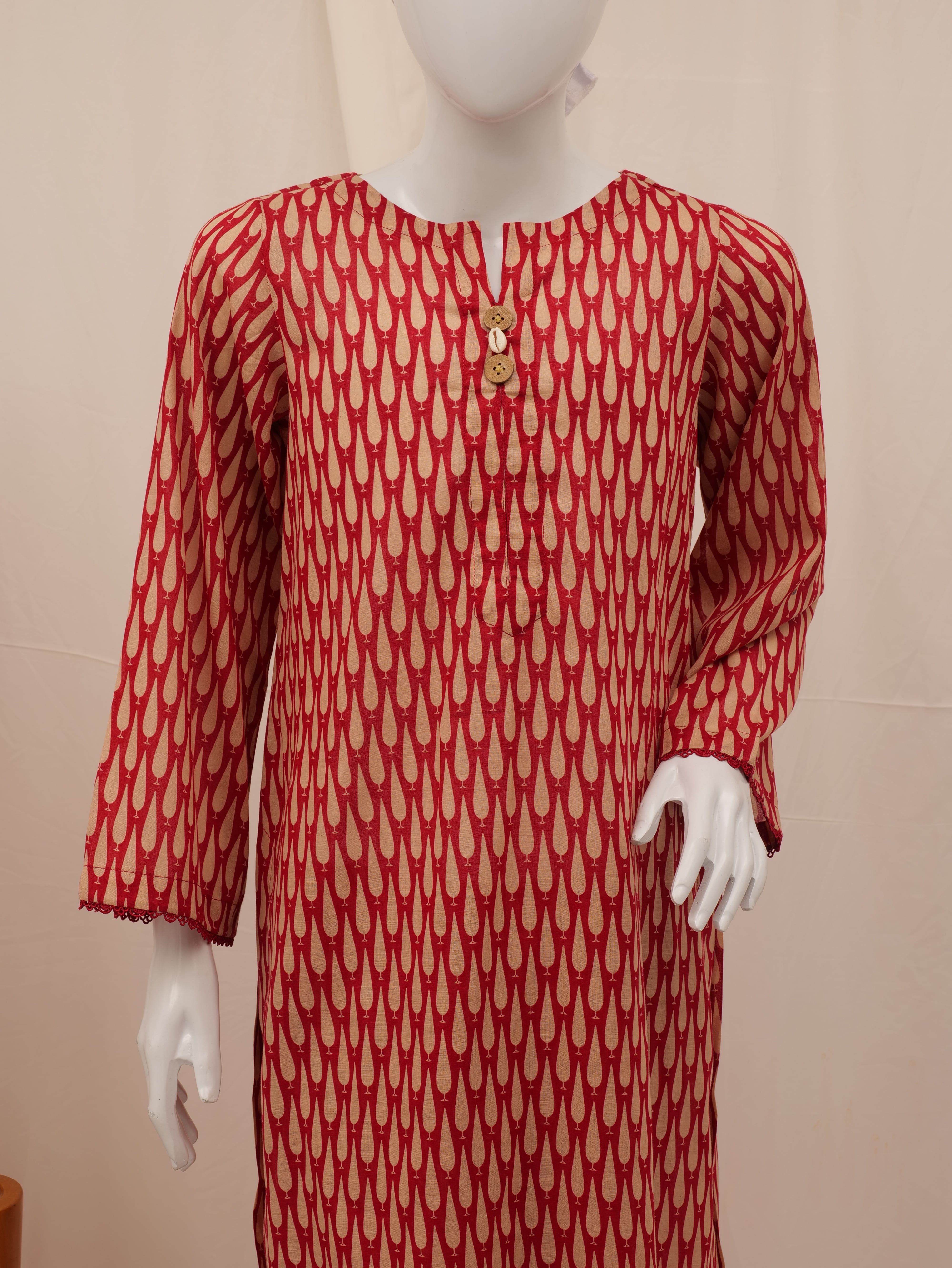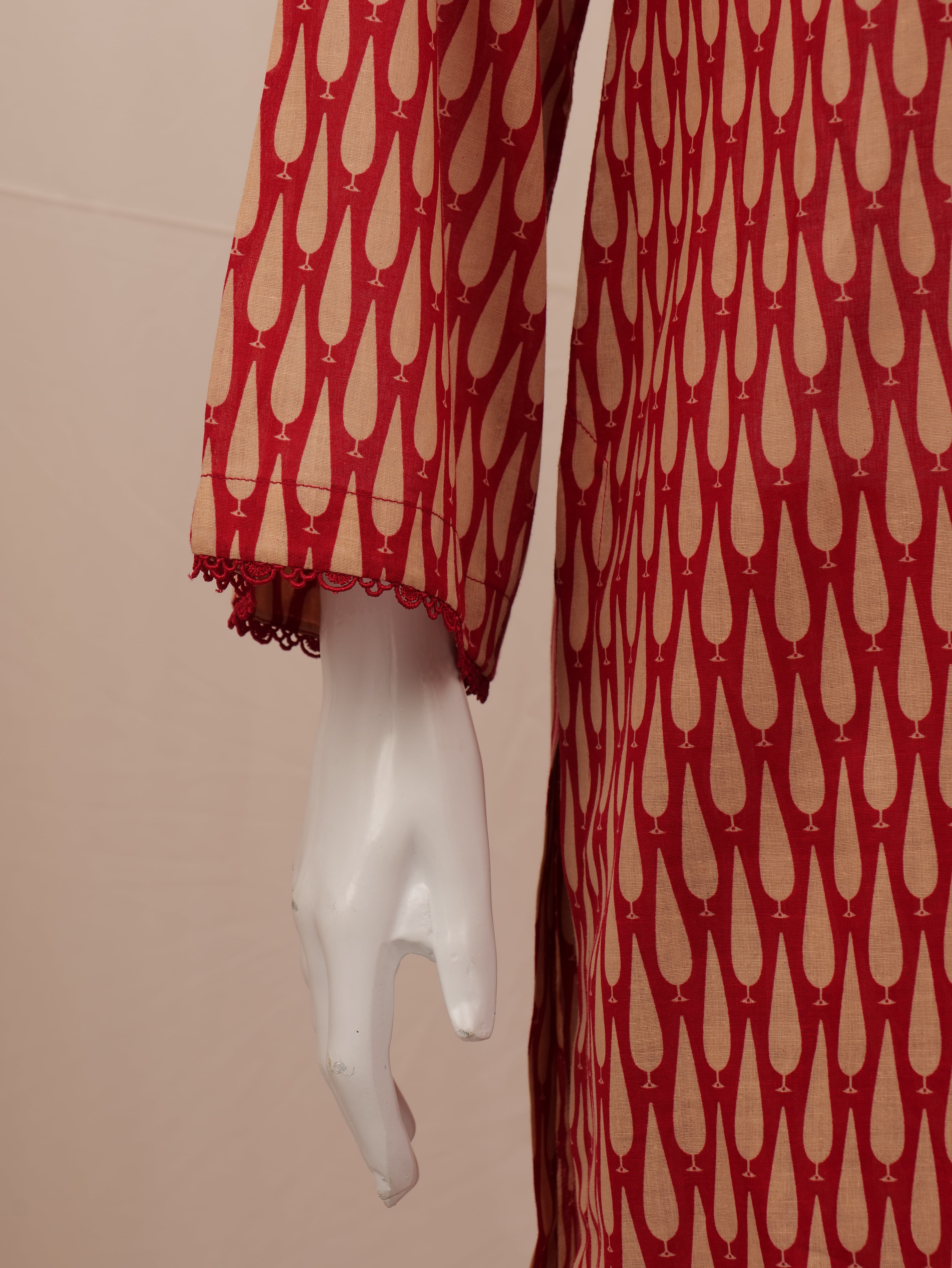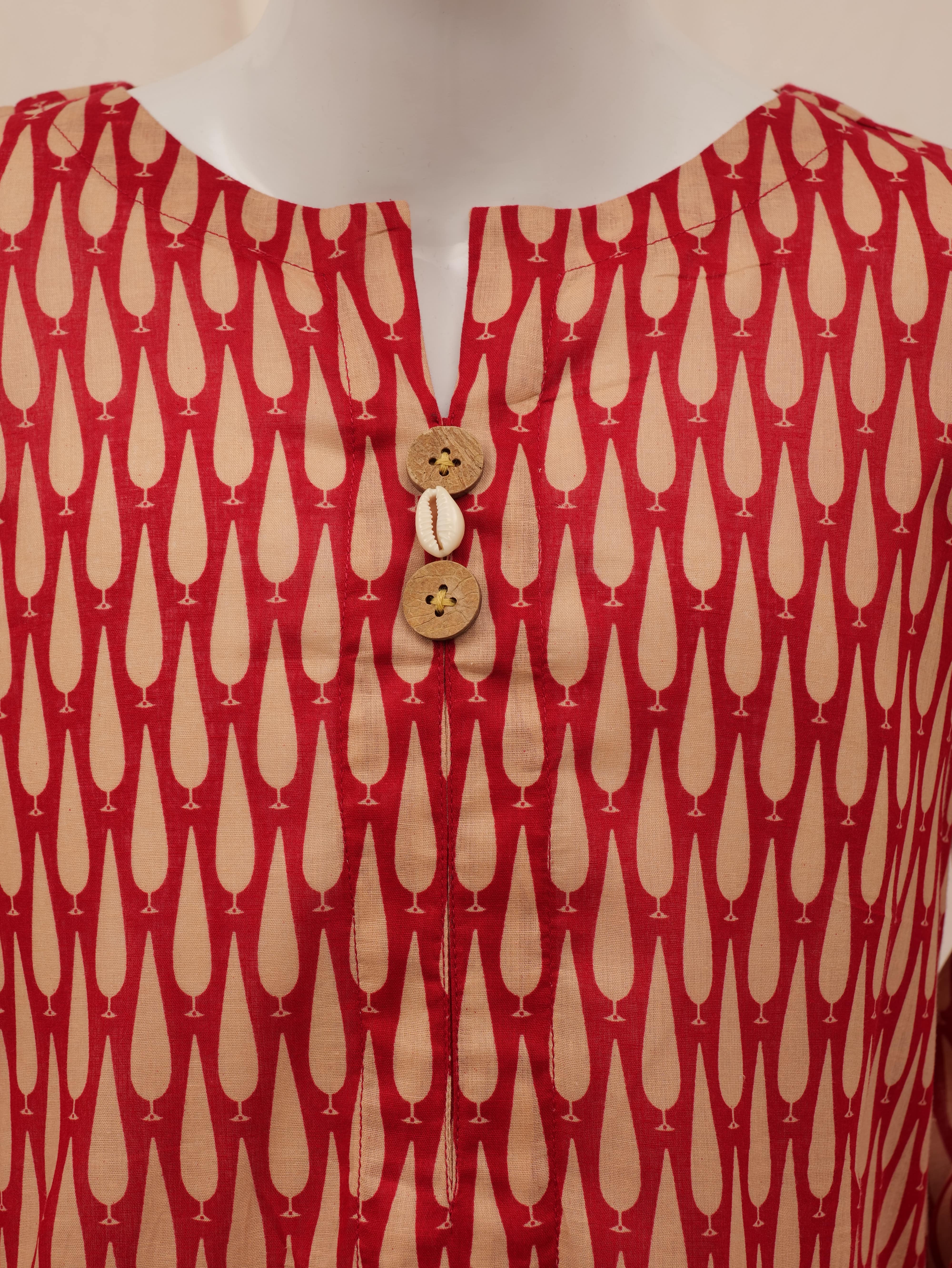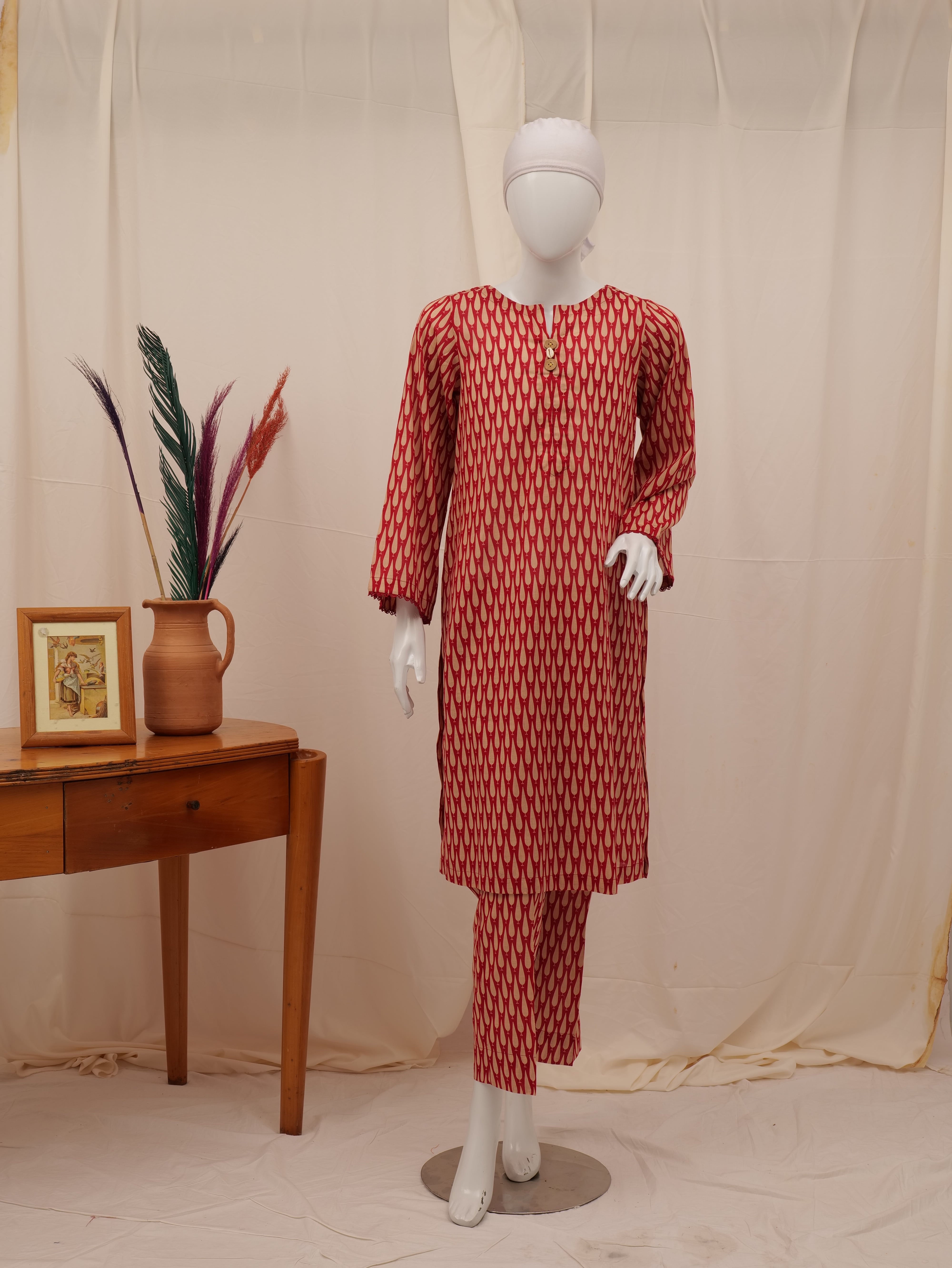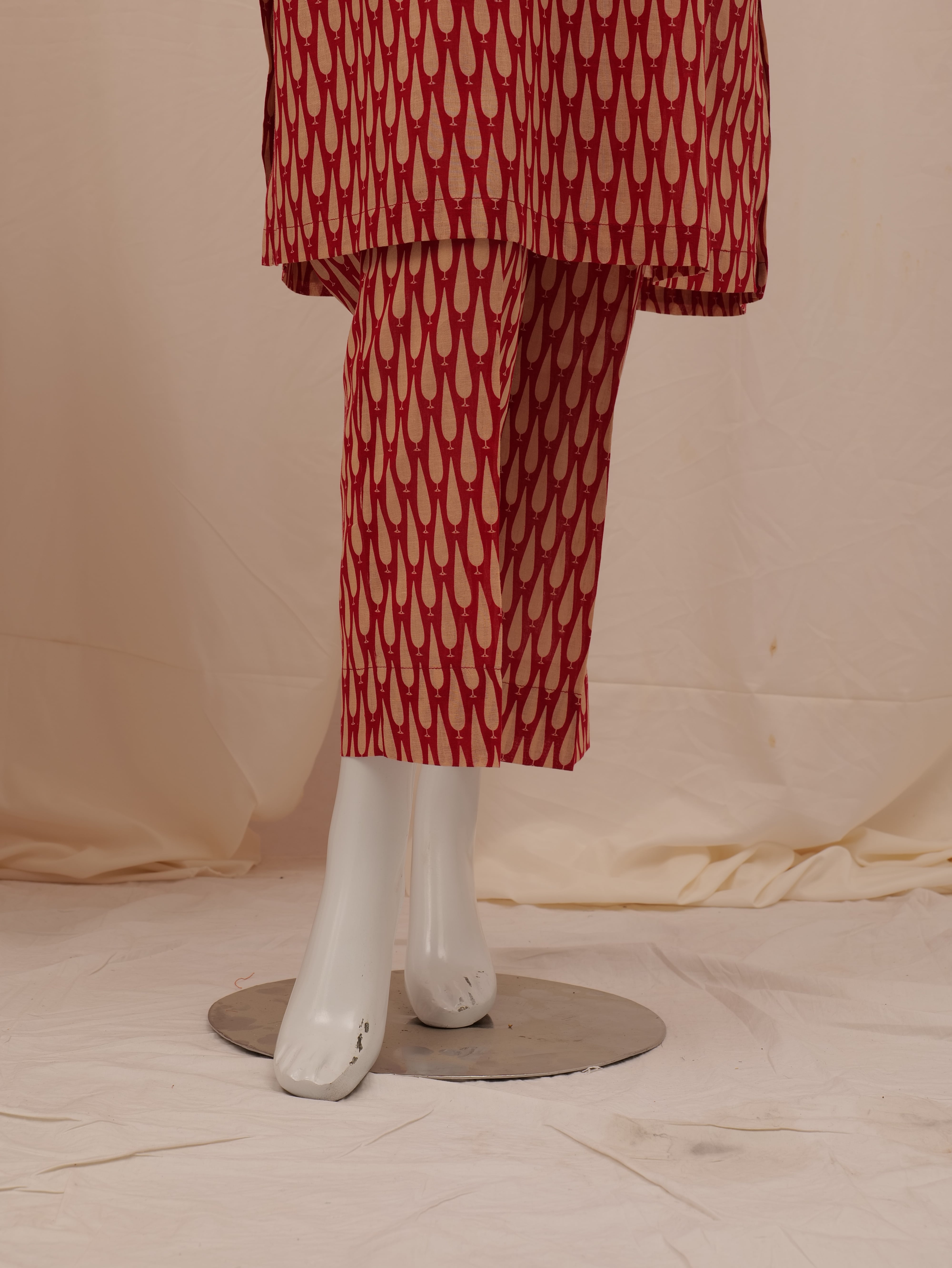 Step into effortless elegance with this contemporary two-piece set. Featuring a bold maroon base adorned with geometric-inspired prints in soft beige, the design strikes the perfect balance between modern style and traditional charm. The kurta comes with a round neckline and a front slit, detailed with minimal button accents for a refined touch. Paired with straight-cut trousers, this ensemble is crafted from breathable fabric, ensuring all-day comfort while keeping your look chic and sophisticated.