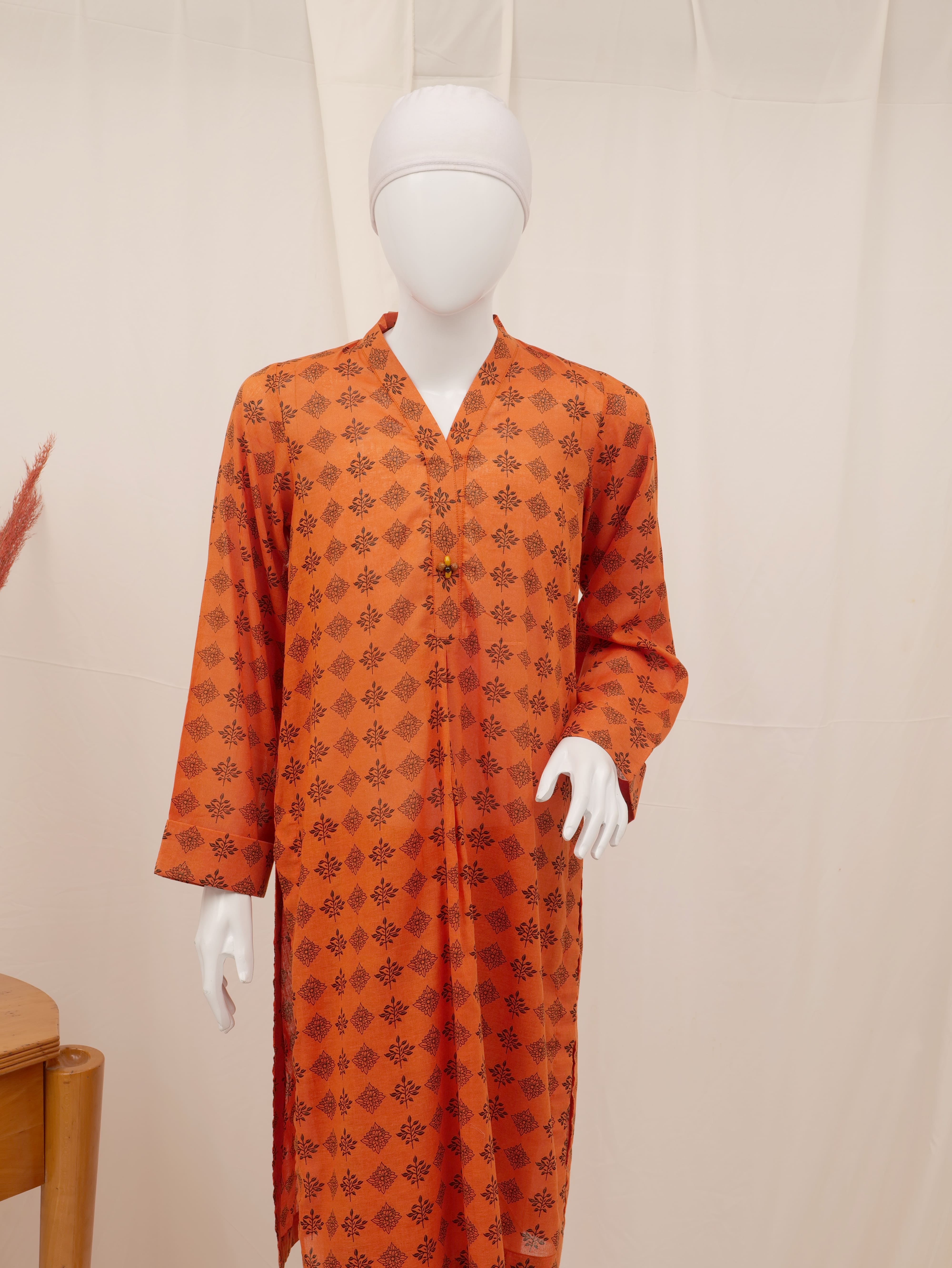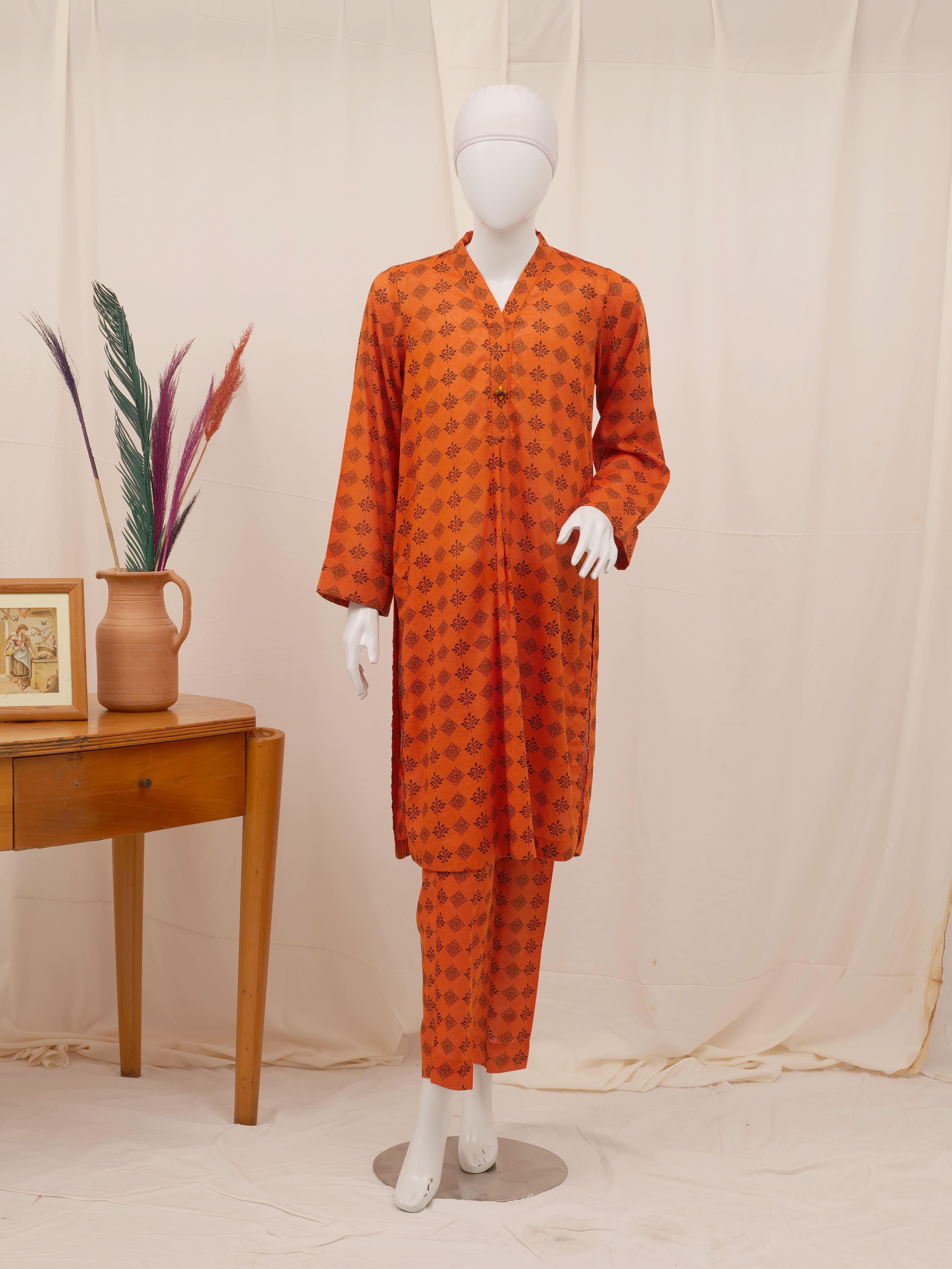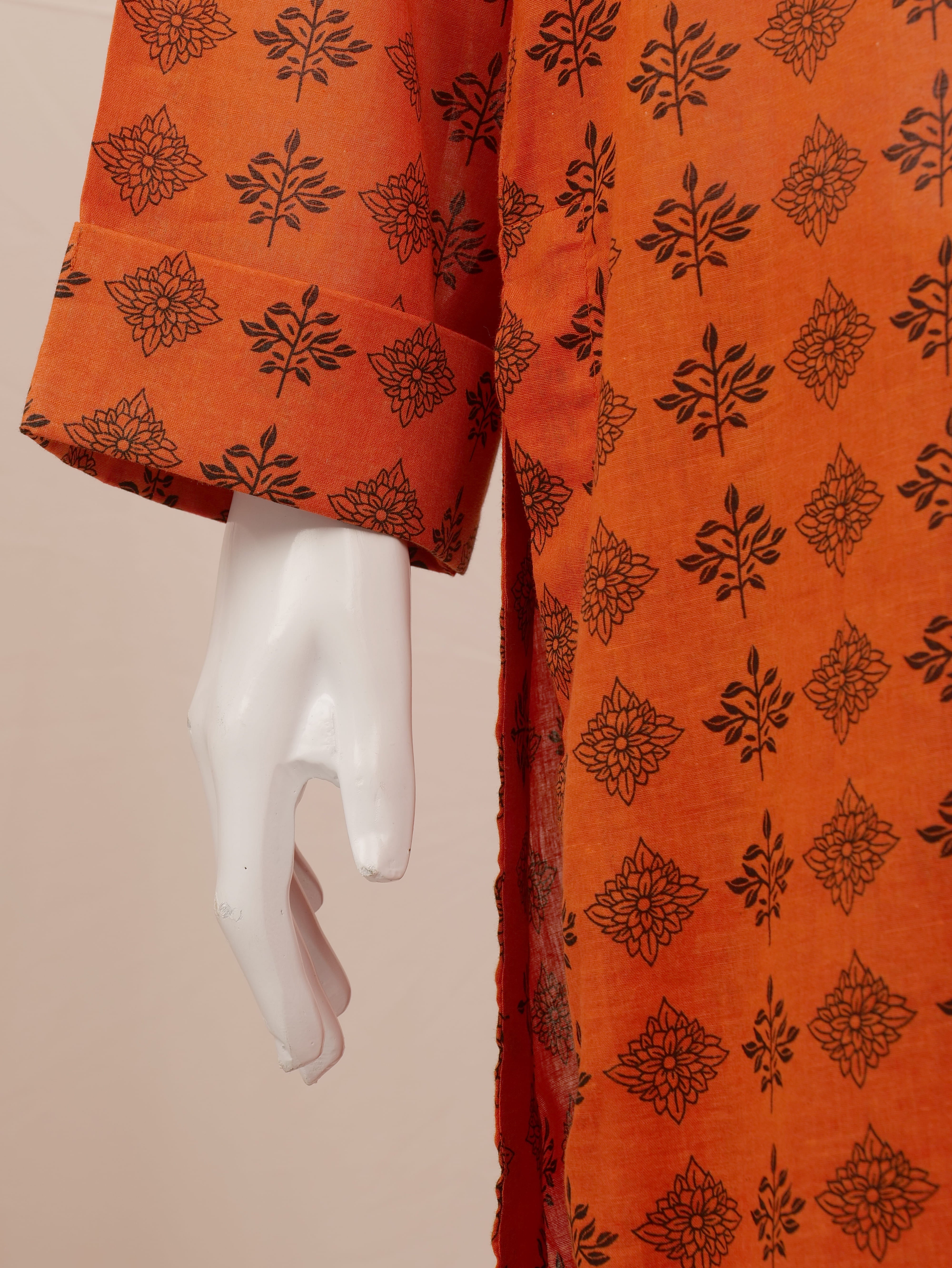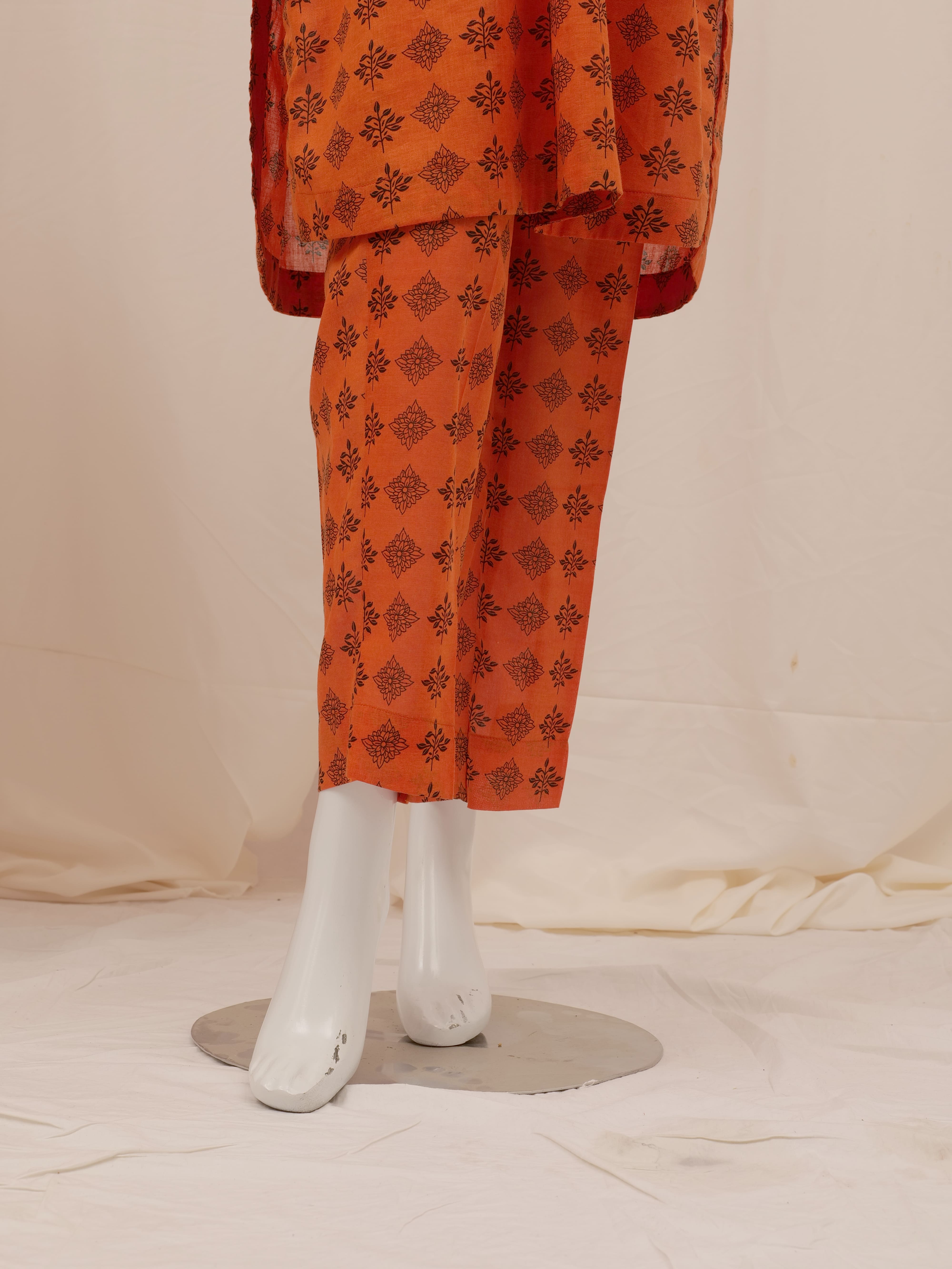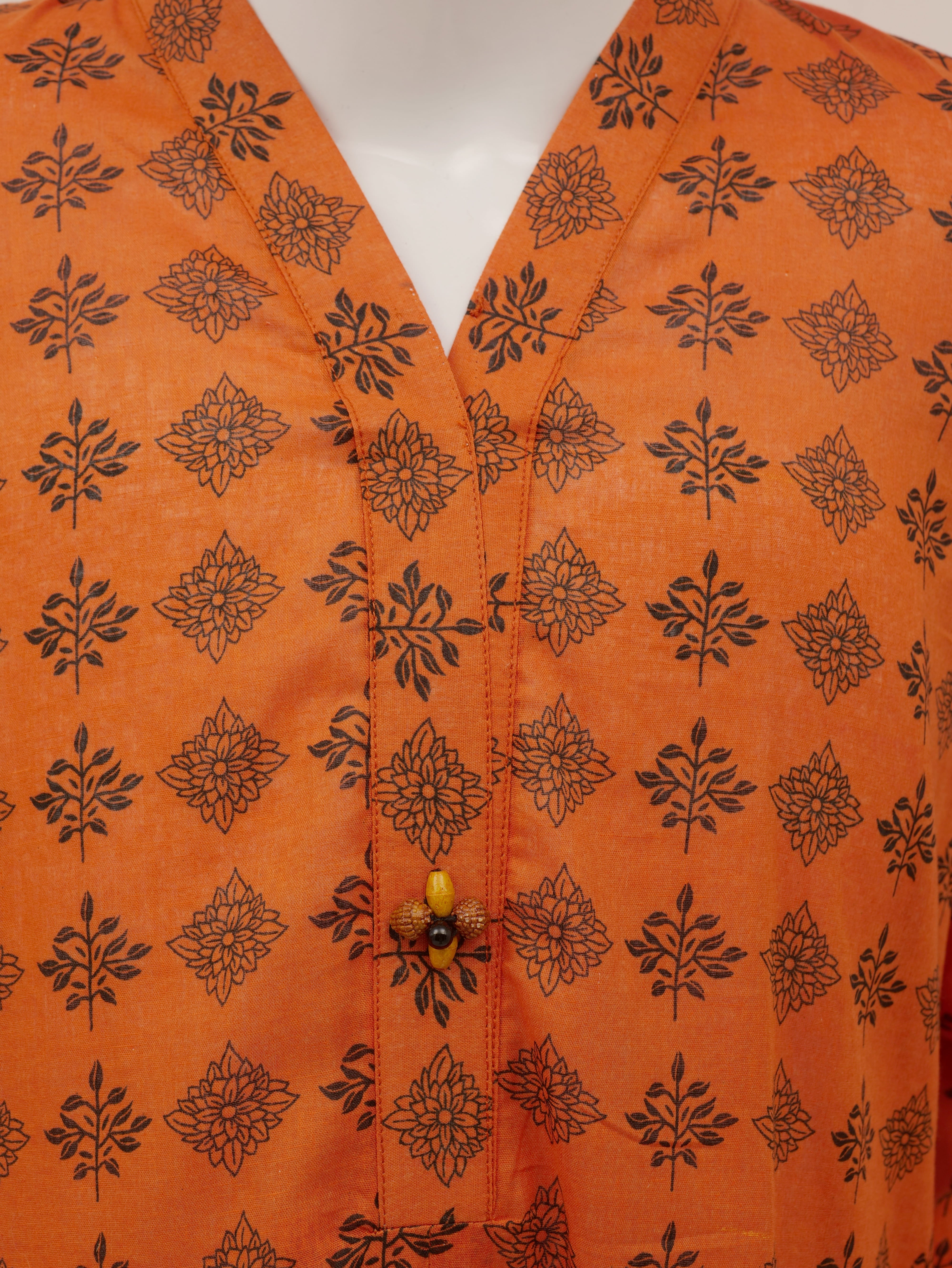 Make a bold yet elegant style statement with this vibrant two-piece ensemble. Designed on a rich burnt-orange base, the outfit features a minimal all-over block print that adds a traditional yet contemporary charm. The kurta is styled with a V-slit neckline accented with button detailing, paired with straight trousers for a sleek and comfortable silhouette. Crafted from soft, breathable fabric, this set blends effortless comfort with timeless appeal—perfect for casual outings or everyday wear.